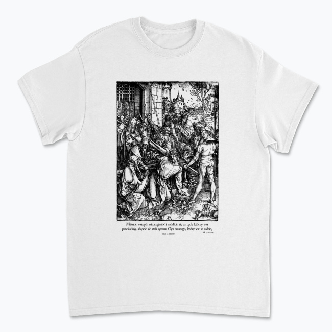 Drzeworyt Albrechta Dürera, będący częścią Wielkiej Pasji, przedstawia Jezusa upadającego pod ciężarem krzyża za bramą Jerozolimy. Poza Jezusem widać na nim świętą Weronikę, która wyciąga chustę w Jego stronę, strażników i tłum gapiów, w którym znajdziemy św. Jana i Najświętszą Maryję Pannę, a także żydowskich kapłanów i faryzeuszy. Pod naszym cyfrowym podrasowaniem tego renesansowego dzieła umieściliśmy cytat z piątego rozdziału Ewangelii według św. Mateusza, w którym Chrystus poucza nas, abyśmy kochali swoich nieprzyjaciół i modlili się za tych, którzy nas prześladują.