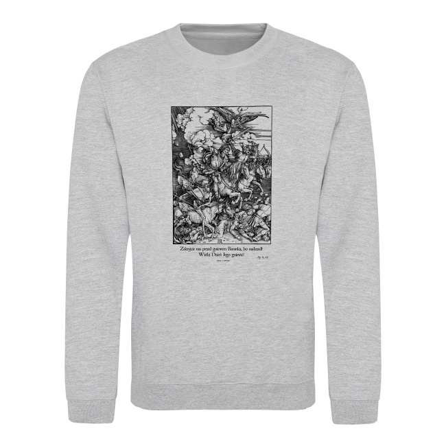 Pod drzeworytem znajduje się cytat z dwóch ostanich wersów z szóstego rozdziału Apokalipsy, w którym opisywani są jeźdźcy. Ich pełen tekst brzmi: «Padnijcie na nas i zakryjcie nas przed obliczem Zasiadającego na tronie i przed gniewem Baranka, bo nadszedł Wielki Dzień Jego gniewu, a któż zdoła się ostać?». Naszym zdaniem idelanie pasuje do tego drzeworytu.