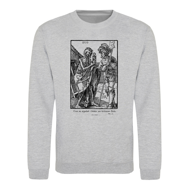Śmierć i Lansquenet – drzeworyt Albrechta Dürera. Dzieło niemieckiego renesansowego będące alegorycznym, symbolicznym przedstawieniem przemijania. Pokazuje kościotrupa z klepsydrą w ręku, pokazującego ją żołnierzowi. Człowiek, który wielokrotnie wysyłał innych na drugą stronę, teraz orientuje się, że nadszedł jego czas. Wzór na tej koszulce pochodzi z okładki zbioru ilustracji “Mała pasja” autorstwa Albrechta Dürera. W Deus Design Kochamy twórczość Albrechta Dürera za świetny graficzny styl, wyraziste przedstawienie emocji oraz głęboki symbolizm jego prac. Cytat pod drzeworytem pochodzi z Ewangelii Świętego Marka rozdział 1 wers 15 i jest fragmentem ewangelii czytanej w pierwszą niedzielę wielkiego postu. Jest to część mówiąca o poszczeniu Chrystusa na pustyni i jego późniejszym nawoływaniu do nawrócenia.