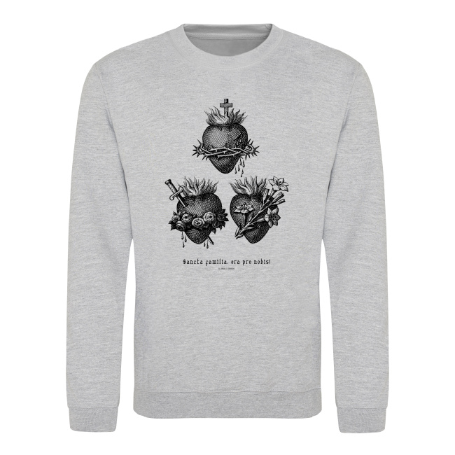 Trzy serca, w metalowym stylu miedziorytu, razem symbolizujące świętą rodzinę. Na tej katolickiej bluzie znajdziecie Serce z koroną cierniową i krzyżem to Najświętsze Serce Jezusa Chrystusa. Serce przebite mieczem i otoczone wieńcem kwiatów to Niepokalane Serce Najświętszej Maryi Panny. Serce Te trzy serca są nie tylko symbolami członków Świętej Rodziny, ale także mistycznymi skarbnicami ich cnót i obiektami kultu. Pod nimi na bluzie znajduje się napis “Sancta Familia ora Pro Nobis”, czyli modlitwa “Święta Rodzino, Módl się za nami”.