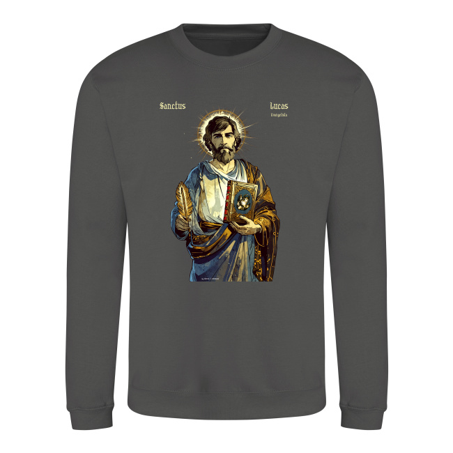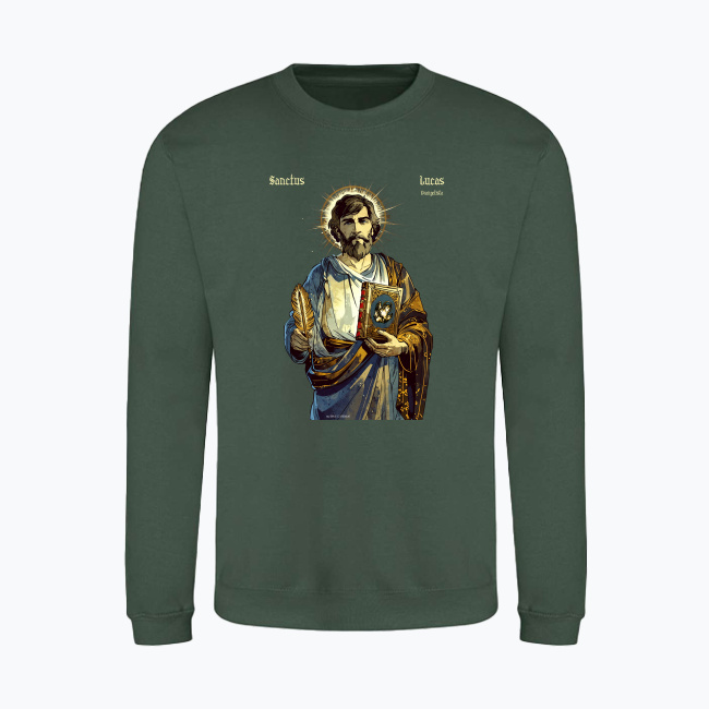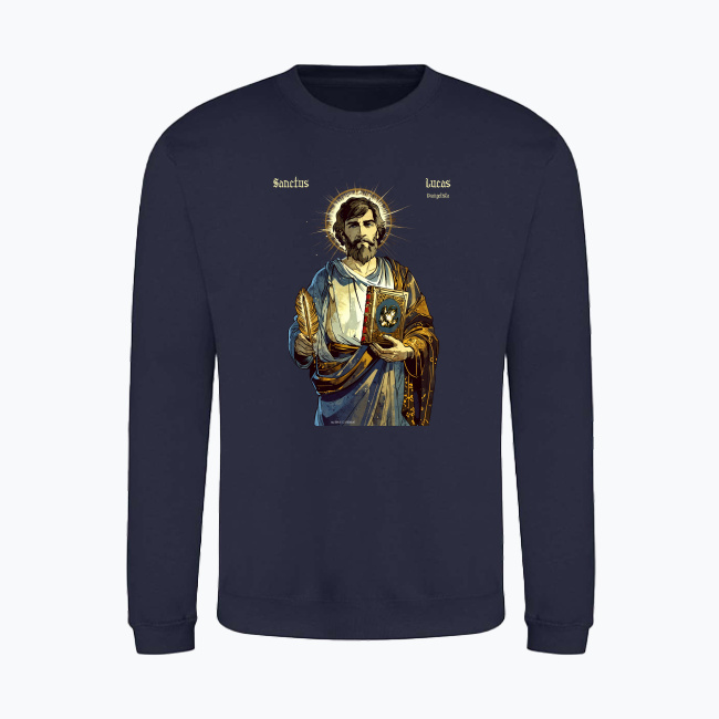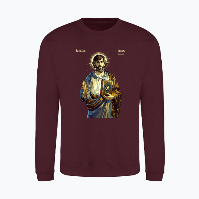 Święty Łukasz — autor Ewangelii i Dziejów Apostolskich, towarzysz św. Pawła Apostoła. Patron lekarzy, grafików, chirurgów, malarzy, introligatorów, rzeźbiarzy, historyków, notariuszy, złotników i Hiszpanii. Prezentowany tutaj projekt, ikona świętego Łukasza jest autorskim dziełem naszego grafika. Przedstawiony na tej bluzie z katolickim nadrukiem, z piórem w jednej oraz księgą w drugiej ręce. Na księdze znajduje się byk — symbol ewangelisty. Ma on na sobie ozdobną szatę, wzorowaną na późnoantycznych ubiorach, a zza jego głowy wyłania się promienista aureola. Ta bluza ze świętym została zaprojektowana w stylu wzorowanym z jednej strony na komiksach takich jak Thorgal, z drugiej na impresjonistycznych malunkach kładących nacisk na “malowanie światłem”. Patrzymy na tę bluzę chrześcijańską jako na nowoczesną stylem ikonę świętego Łukasza Ewangelisty.