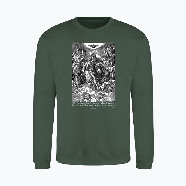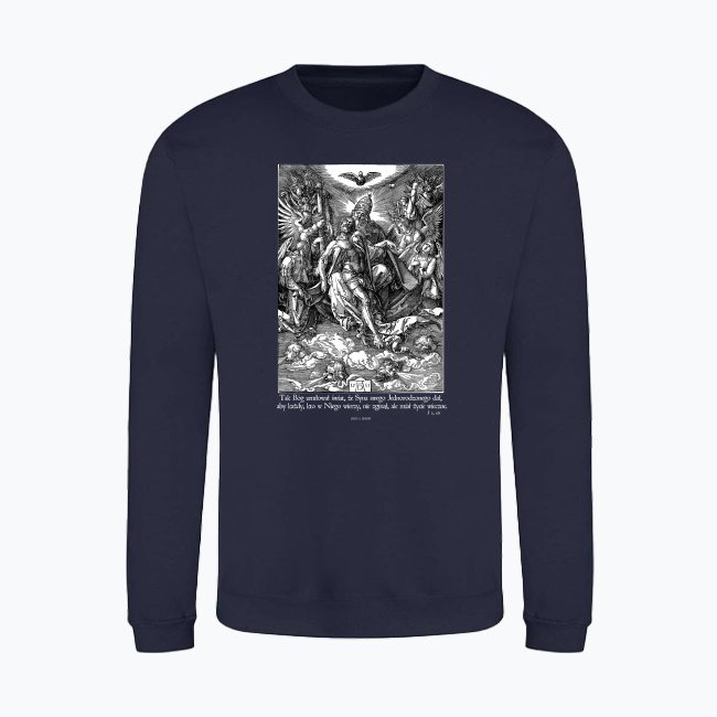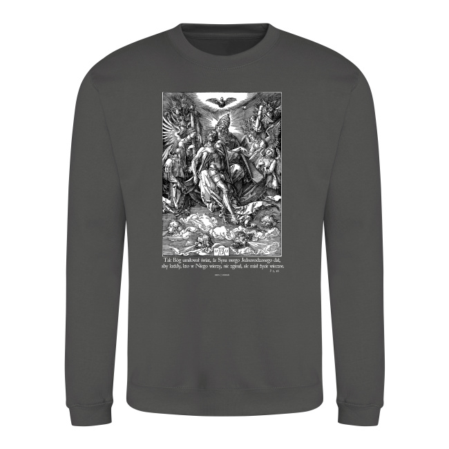 Postanowiliśmy połączyć ten drzeworyt z cytatem z Ewangelii świętego Jana: “Tak bowiem Bóg umiłował świat, że Syna swego Jednorodzonego dał, aby każdy, kto w Niego wierzy, nie zginął, ale miał życie wieczne.”, ponieważ drzeworyt ukazuje Ojca niejako prezentującego światu swojego martwego, zajętego z krzyża Syna.