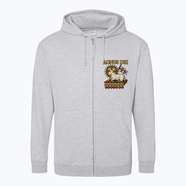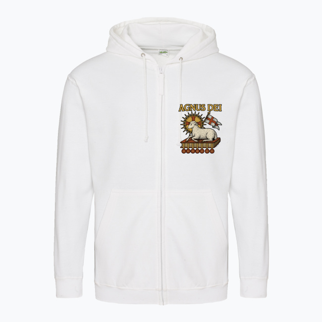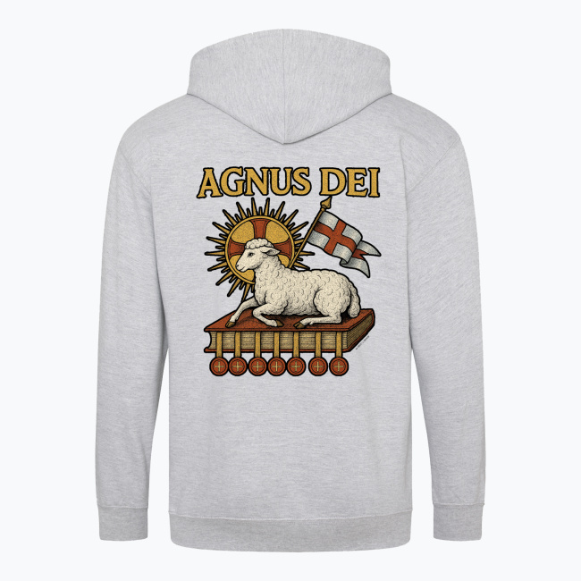 Ten projekt przedstawia Baranka Bożego siedzącego na apokaliptycznej księdze z siedmioma pieczęciami. Baranek ma aureolę oraz trzyma białą flagę z czerwonym krzyżem Zmartwychwstałego Chrystusa. Górny napis Agnus Dei to po prostu “Baranek Boży” po łacinie. Stylistycznie tworząc ten nadruk inspirowaliśmy się częściowo manuskryptami, częściowo standardowymi grafikami koszulkowymi, a częściowo grafikami z mszałów.