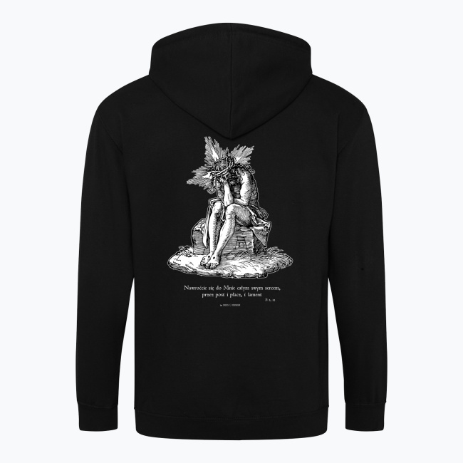 Chrystus Frasobliwy — czyli przedstawienie Jezusa w pozycji siedzącej, rozmyślającego, smutnego i zmartwionego, z korną cierniową, i śladami biczowania. Alegoryczne przedstawienie całości męki Pańskiej w jednym obrazie. Wzór na tej koszulce pochodzi z okładki zbioru ilustracji “Mała pasja” autorstwa Albrechta Dürera.  Cytat pod obrazem pochodzi z księgi Joela, a na piersi znajdują się ręce złożone do modlitwy, także autorstwa Dürera.