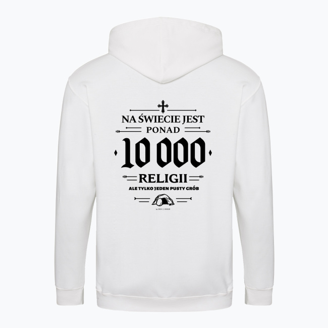 Na świecie jest ponad 10 tysięcy religii, ale tylko jeden pusty grób. Apologetyczno — ewangelizacyjna bluza. Projektując ten nadruk, chcieliśmy się bezpośrednio odnieść do braku nadprzyrodzonych dowodów na prawdziwość innych religii, oraz do wielkości łaski, jaką uczynił nam Chrystus, Zmartwychwstając i otwierając nam drogę do Nieba.