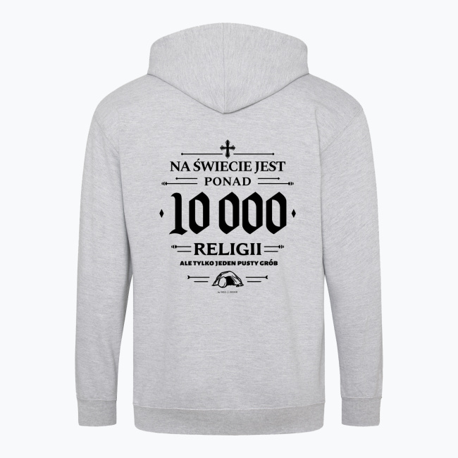 Na świecie jest ponad 10 tysięcy religii, ale tylko jeden pusty grób. Apologetyczno — ewangelizacyjna bluza. Projektując ten nadruk, chcieliśmy się bezpośrednio odnieść do braku nadprzyrodzonych dowodów na prawdziwość innych religii, oraz do wielkości łaski, jaką uczynił nam Chrystus, Zmartwychwstając i otwierając nam drogę do Nieba.