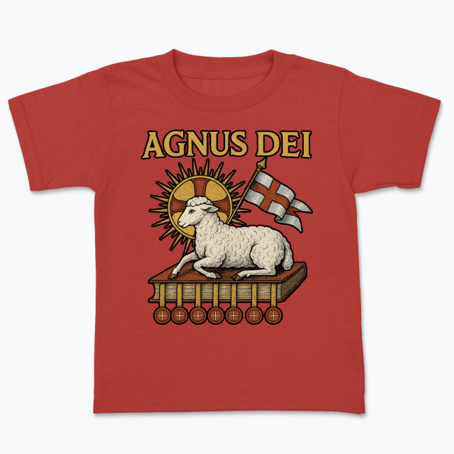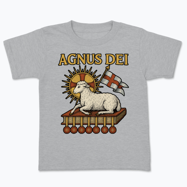 Ten projekt przedstawia Baranka Bożego siedzącego na apokaliptycznej księdze z siedmioma pieczęciami. Baranek ma aureolę oraz trzyma białą flagę z czerwonym krzyżem Zmartwychwstałego Chrystusa. Górny napis Agnus Dei to po prostu “Baranek Boży” po łacinie. Stylistycznie tworząc ten nadruk inspirowaliśmy się częściowo manuskryptami, częściowo standardowymi grafikami koszulkowymi, a częściowo grafikami z mszałów.