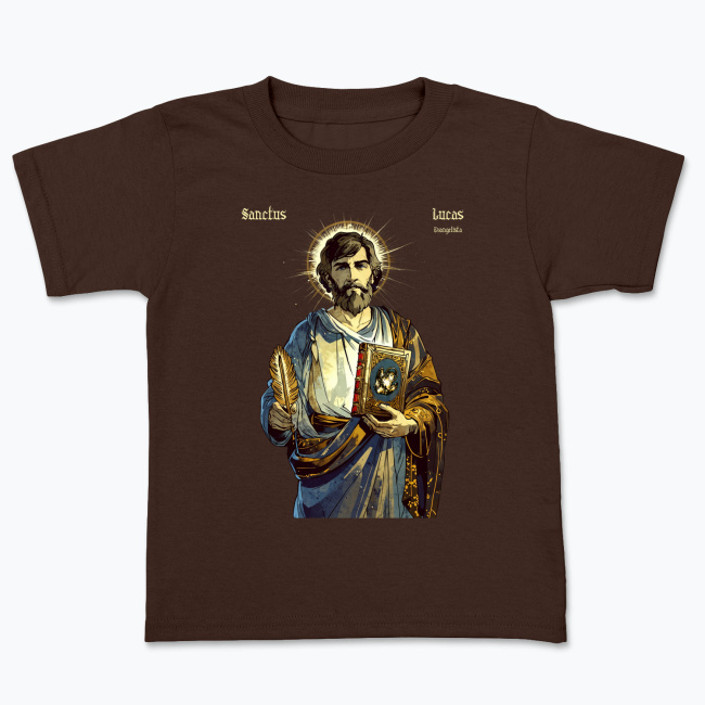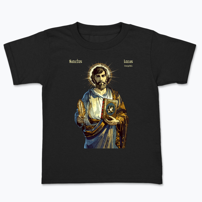 Święty Łukasz — autor Ewangelii i Dziejów Apostolskich, towarzysz św. Pawła Apostoła. Patron lekarzy, grafików, chirurgów, malarzy, introligatorów, rzeźbiarzy, historyków, notariuszy, złotników i Hiszpanii. Prezentowany tutaj projekt, ikona świętego Łukasza jest autorskim dziełem naszego grafika. Przedstawiony na tej koszulce z katolickim nadrukiem, z piórem w jednej oraz księgą w drugiej ręce. Na księdze znajduje się byk — symbol ewangelisty. Ma on na sobie ozdobną szatę, wzorowaną na późnoantycznych ubiorach, a zza jego głowy wyłania się promienista aureola. Ta koszulka męska ze świętym została zaprojektowana w stylu wzorowanym z jednej strony na komiksach takich jak Thorgal, z drugiej na impresjonistycznych malunkach kładących nacisk na “malowanie światłem”. Patrzymy na tę koszulkę chrześcijańską jako na nowoczesną stylem ikonę świętego Łukasza ewangelisty.