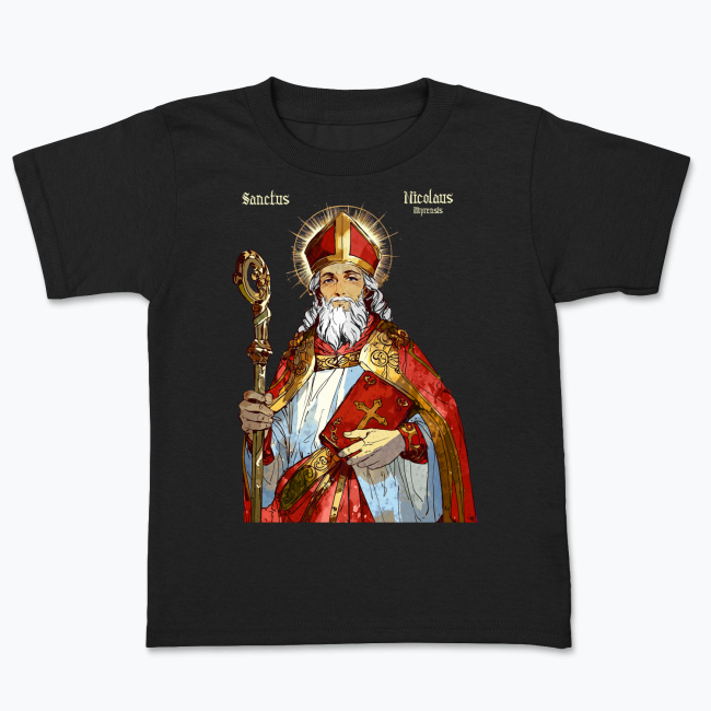 Święty Mikołaj — biskup z Miry, znany ze swojej świętości, dobroci i licznych cudów. Patron dzieci, żeglarzy, kupców, piekarzy, więźniów, podróżnych oraz ubogich. Przedstawiony na koszulce w biskupich szatach z mitrą na głowie. W jednej ręce trzyma pastorał, symbol opieki duchowej, a w drugiej księgę, nawiązującą do mądrości Kościoła. Grafika zaprojektowana w stylu łączącym elementy komiksu, subtelnego impresjonizmu i tradycyjnej ikonografii sakralnej. Ta nowoczesna interpretacja przedstawia świętego Mikołaja jako ponadczasowy wzór miłosierdzia i dobroci w dynamicznej, artystycznej formie.