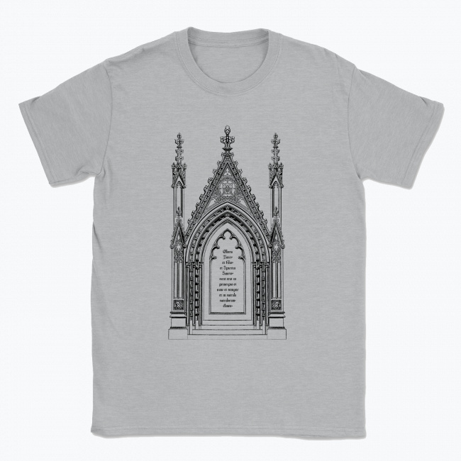 Nadruk przedstawia szkic okna gotyckiego, na środku którego zapisana jest modlitwa: “Chwała Ojcu i Synowi i Duchowi Świętemu, jak była na początku teraz i zawsze na wieki wieków. Amen.” Po łacinie brzmi ona: “Gloria Patri, et Filio, et Spiritui Sancto. Sicut erat in principio, et nunc, et semper, et in saecula saeculorum. Amen.” Jest to piękne, stylowe wręcz, wyrażenie swojej wiary i chwalebna modlitwa zarazem.