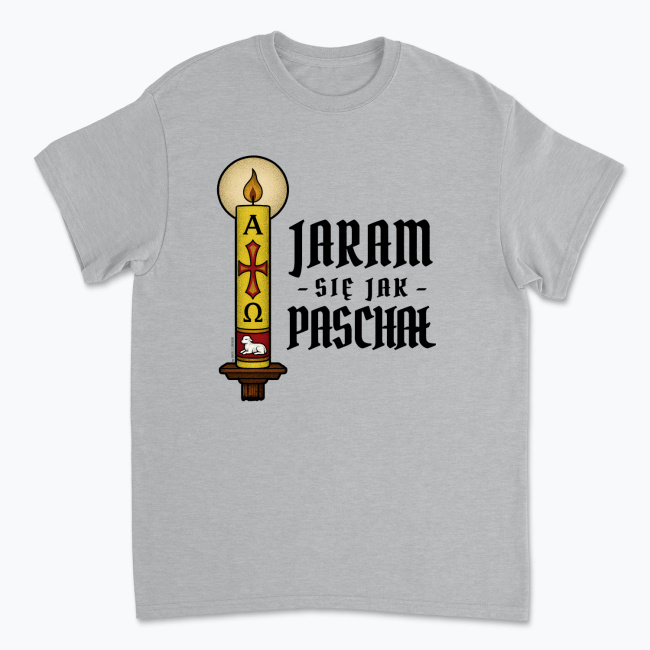 Projekt składa się z gotyckiego napisu “Jaram się jak paschał” i rysunkowego paschału z Barankiem Bożym, znakami alfy i omegi, wszystko okraszone lekką teksturą i wycieniowaniem.