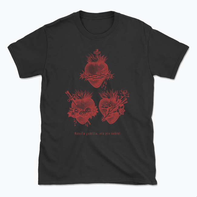Trzy serca, w metalowym stylu miedziorytu, razem symbolizujące świętą rodzinę. Na tej katolickiej bluzie znajdziecie Serce z koroną cierniową i krzyżem to Najświętsze Serce Jezusa Chrystusa. Serce przebite mieczem i otoczone wieńcem kwiatów to Niepokalane Serce Najświętszej Maryi Panny. Serce Te trzy serca są nie tylko symbolami członków Świętej Rodziny, ale także mistycznymi skarbnicami ich cnót i obiektami kultu. Pod nimi na bluzie znajduje się napis “Sancta Familia ora Pro Nobis”, czyli modlitwa “Święta Rodzino, Módl się za nami”.