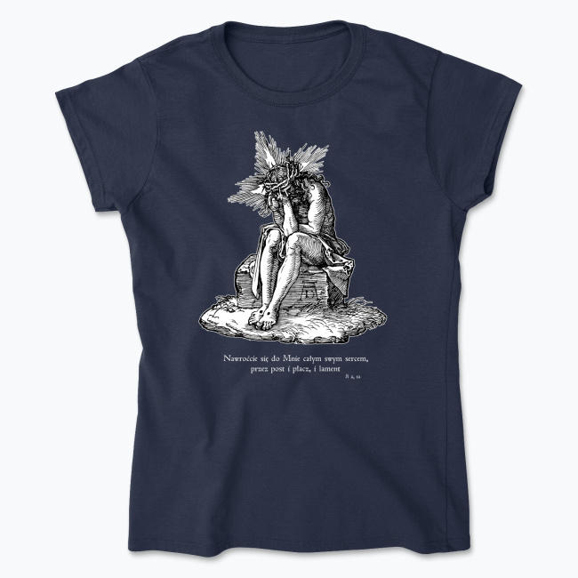 Chrystus Frasobliwy — czyli przedstawienie Jezusa w pozycji siedzącej, rozmyślającego, smutnego i zmartwionego, z korną cierniową, i śladami biczowania. Alegoryczne przedstawienie całości męki Pańskiej w jednym obazie. Wzór na tej koszulce pochodzi z okładki zbioru ilustracji “Mała pasja” autorstwa Albrechta Dürera. W Deus Design Kochamy twórczość Albrechta Dürera za świetny graficzny styl, wyraziste przedstawienie emocji oraz głęboki symbolizm jego prac. Cytat pod obrazem pochodzi z księgi Joela i jest fragmentem pierwszego czytania z mszy ze Środy Popielcowej.