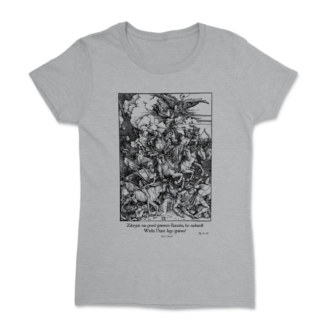 Pod drzeworytem znajduje się cytat z dwóch ostanich wersów z szóstego rozdziału Apokalipsy, w którym opisywani są jeźdźcy. Ich pełen tekst brzmi: «Padnijcie na nas i zakryjcie nas przed obliczem Zasiadającego na tronie i przed gniewem Baranka, bo nadszedł Wielki Dzień Jego gniewu, a któż zdoła się ostać?». Naszym zdaniem idelanie pasuje do tego drzeworytu.