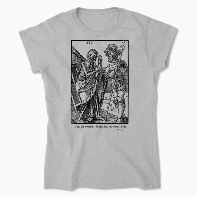 Wybraliśmy ten drzeworyt jako idealnie pasujący do cytatu “Czas się wypełnił i bliskie jest królestwo Boże.” Śmierć pokazująca człowiekowi, ze jego czas na sąd ostateczny nadszedł, idealnie obrazuje niechybny kres przemijania na tym świecie. Razem z dalszą, bardzo wielkopostną częścią wypowiedzi Jezusa “Nawracajcie się i wierzcie w Ewangelię!” jest zawołaniem do właśnie nawrócenia, duchowego oczyszczenia, spowiedzi i refleksji nad własnym życiem. Mamy nadzieję, że właśnie takie emocje ta katolicka, chrześcijańska koszulka będzie wywoływać u tych, którzy będą ja nosić i widzieć.
