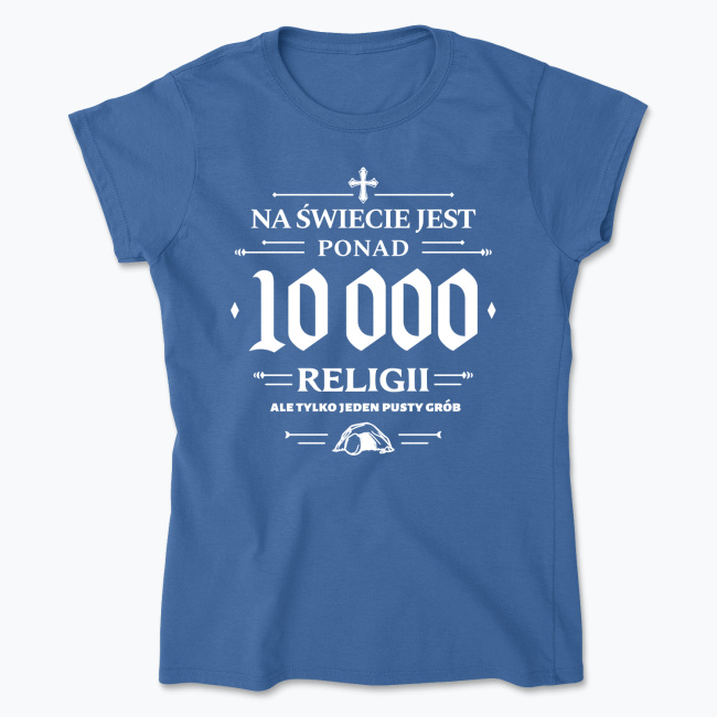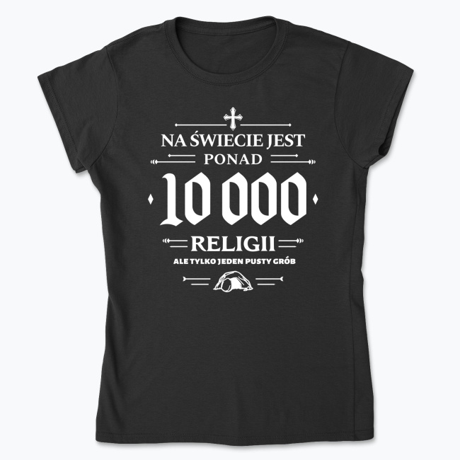 Na świecie jest ponad 10 tysięcy religii, ale tylko jeden pusty grób. Apologetyczno — ewangelizacyjna damska koszulka. Projektując ten nadruk, chcieliśmy się bezpośrednio odnieść do braku nadprzyrodzonych dowodów na prawdziwość innych religii, oraz do wielkości łaski, jaką uczynił nam Chrystus, Zmartwychwstając i otwierając nam drogę do Nieba.