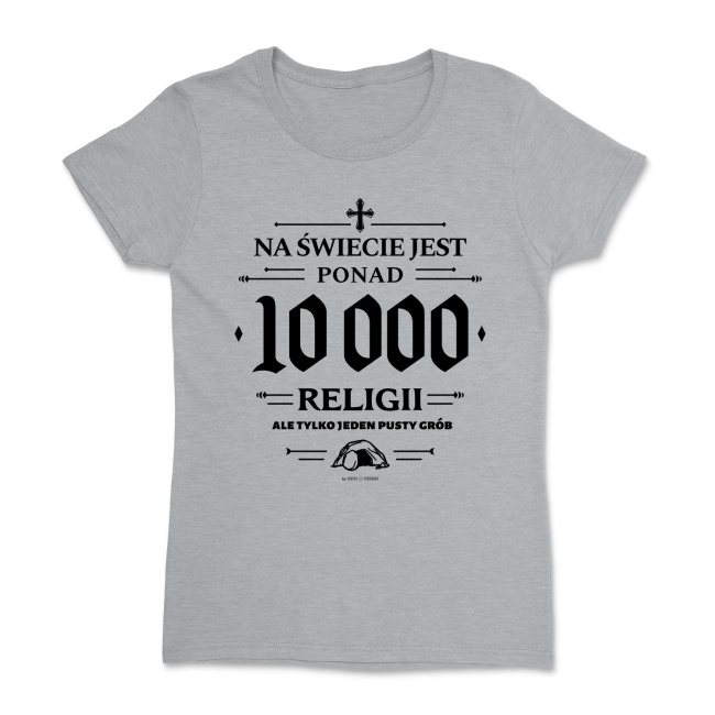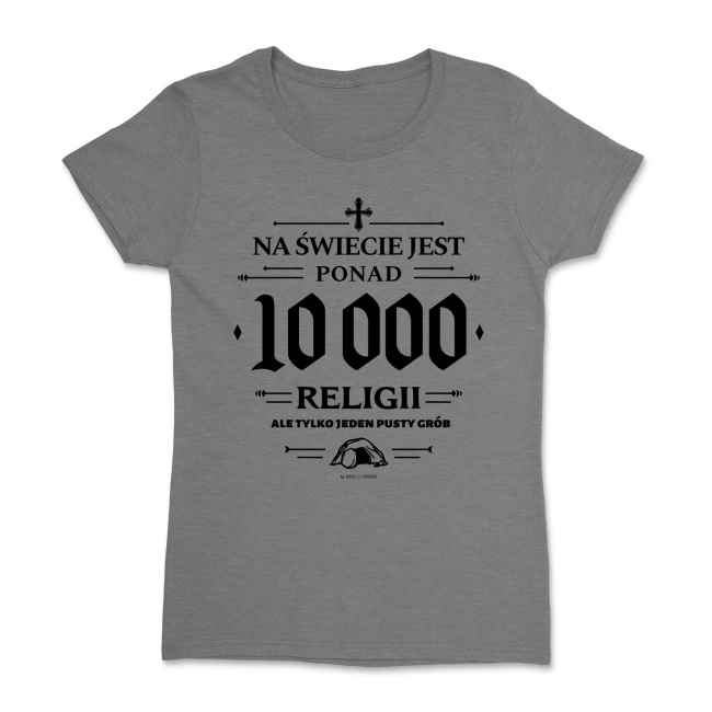 Na świecie jest ponad 10 tysięcy religii, ale tylko jeden pusty grób. Apologetyczno — ewangelizacyjna damska koszulka. Projektując ten nadruk, chcieliśmy się bezpośrednio odnieść do braku nadprzyrodzonych dowodów na prawdziwość innych religii, oraz do wielkości łaski, jaką uczynił nam Chrystus, Zmartwychwstając i otwierając nam drogę do Nieba.