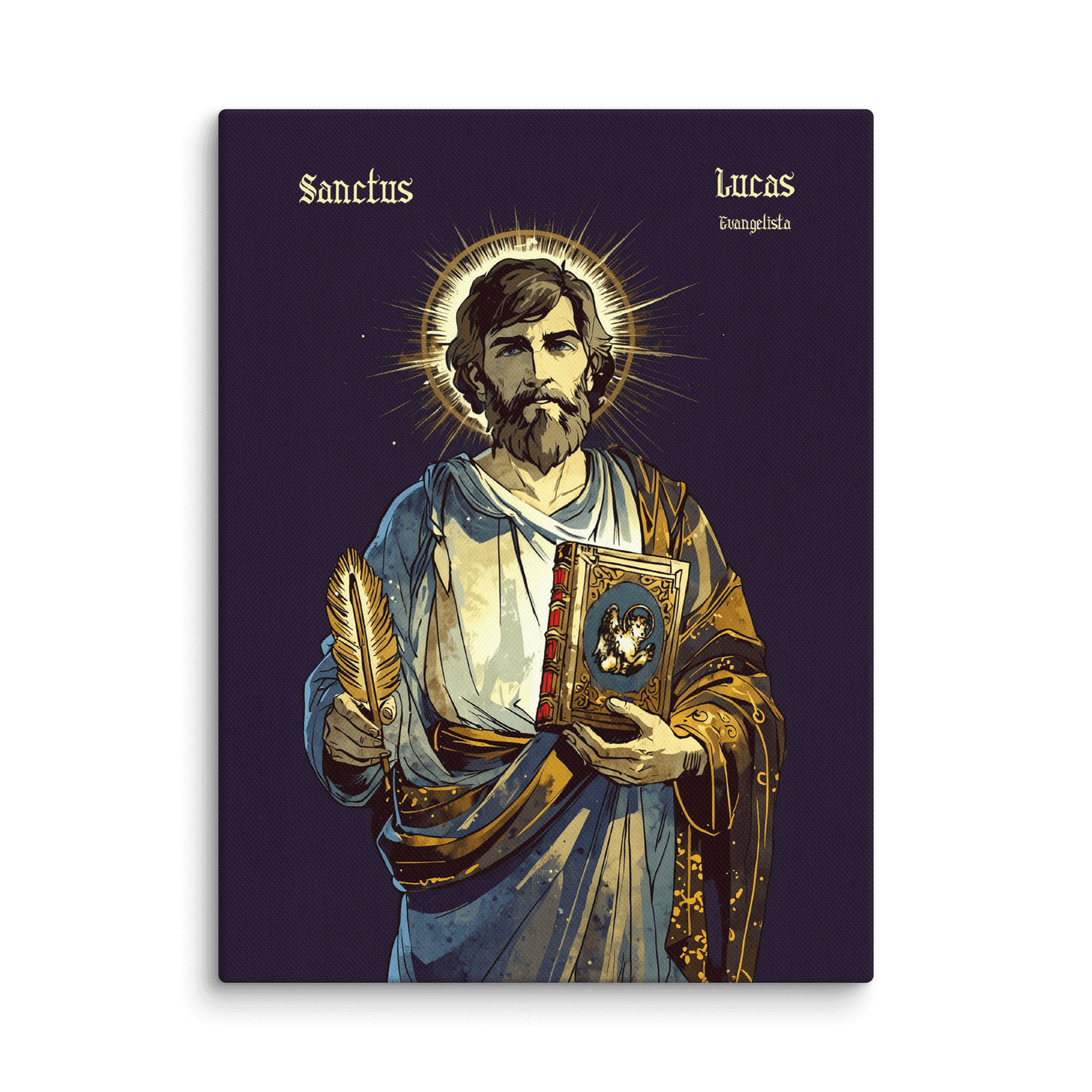 Święty Łukasz — autor Ewangelii i Dziejów Apostolskich, towarzysz św. Pawła Apostoła. Patron lekarzy, grafików, chirurgów, malarzy, introligatorów, rzeźbiarzy, historyków, notariuszy, złotników i Hiszpanii. Prezentowany tutaj projekt, ikona świętego Łukasza jest autorskim dziełem naszego grafika. Przedstawiony na tej koszulce z katolickim nadrukiem, z piórem w jednej oraz księgą w drugiej ręce. Na księdze znajduje się byk — symbol ewangelisty. Ma on na sobie ozdobną szatę, wzorowaną na późnoantycznych ubiorach, a zza jego głowy wyłania się promienista aureola. Ta koszulka męska ze świętym została zaprojektowana w stylu wzorowanym z jednej strony na komiksach takich jak Thorgal, z drugiej na impresjonistycznych malunkach kładących nacisk na “malowanie światłem”. Patrzymy na ten obraz chrześcijańską jako na nowoczesną stylem ikonę świętego Łukasza ewangelisty.